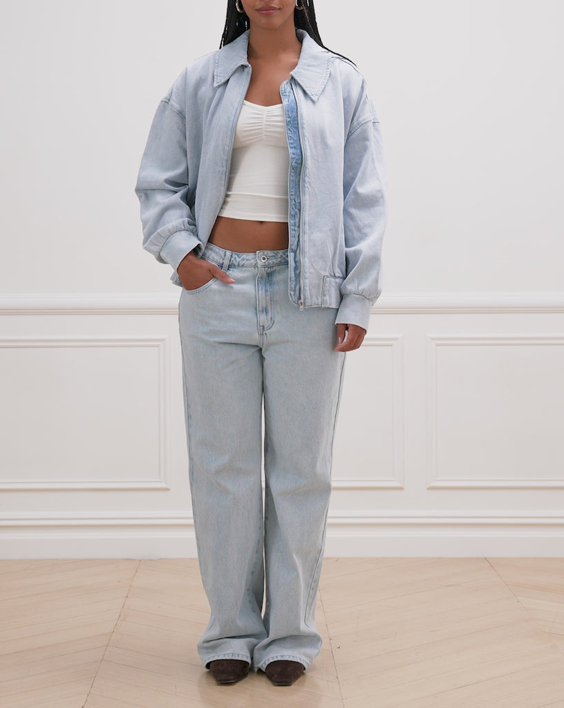 The Denim Bomber Jacket is styled with the Mid Rise Slim Straight Pant.