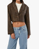 Featuring a unique patina to give it an aged look, this vegan leather blazer is tailored for an oversized, structured fit with padded shoulders. It has a single-breasted front closure and a row of buttons at each cuff.