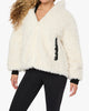 This oversized zip-up jacket is made from sherpa that's naturally warm and soft. It has snaps pockets traced with vegan leather trim, an adjustable hem and a hood that detaches with metal snaps.