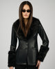 Faux fur details the cuffs and v-neck collar of this vegan leather jacket. It has padded shoulders, a cinched waist that gives way to a loose hem, and a three-button closure.