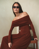 This long-sleeve midi dress is designed to sit off-the-shoulder. It has an overlapping ruched front panel and a u-shaped waist that gives way to a full, gathered skirt, made from double-knit stretch fabric.
