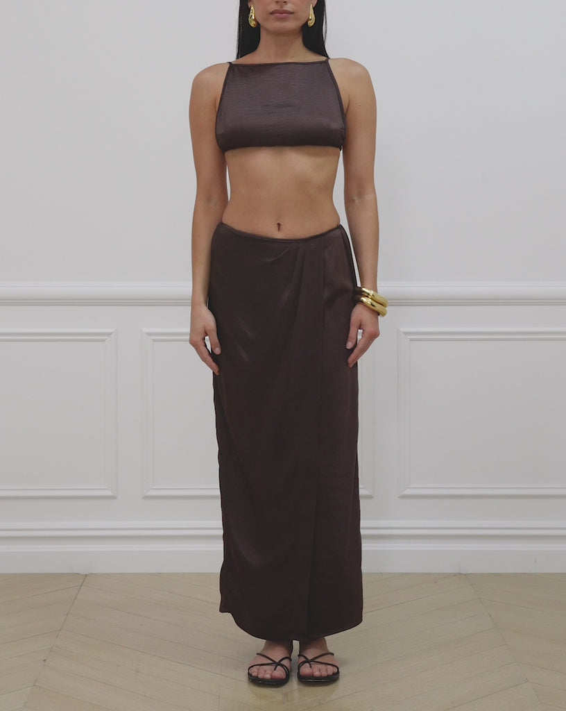 The Backless Square Top is styled with the Draped Front Midi Skirt.