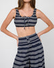 This linen crop top has elastic trim along the scoop neck, shoulder straps, and hem, giving it a scrunched effect.