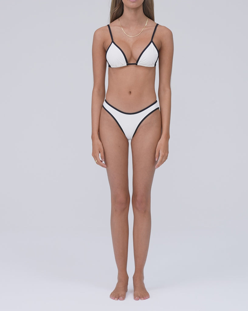 The Cooper is an elongated triangle top with adjustable shoulder straps balanced by a tie-back closure — a more comfortable alternative to traditional halter strings. It features contrast binding for a pop of color.
