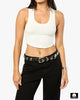 The Cropped Scoop Tank is styled with the Mid Rise Slim Straight Pant.